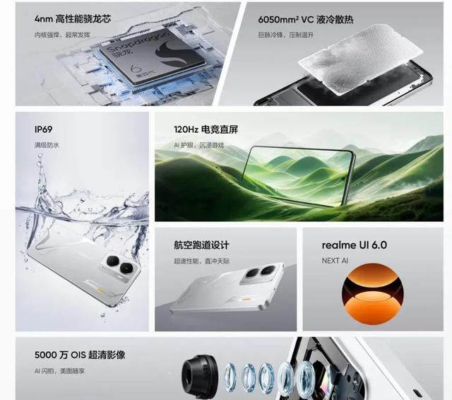 搭载骁龙 6 Gen4 处理器,全系标配 16GB 运行内存,搭载 6050m㎡ VC 液冷散热,内置6000mAh 泰坦电池,支持旁路充电。还搭载 5000 万 OIS 超清影像、全方位感应 NFC、立体双扬声器、realme UI 6.0、AI 传送门 2.0、AI 通话摘要、AI 录音摘要等配置及功能。