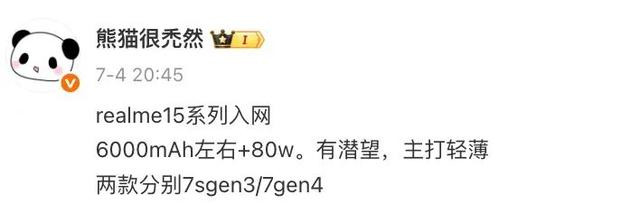 博主@熊猫很禿然 的爆料中也提到了“内置6000mAh左右电池,支持80W快充,配备潜望镜头,主打轻薄,且两款机型分别搭载骁龙 7s Gen3 和骁龙 7 Gen4 处理器”等信息。